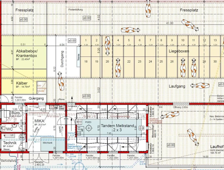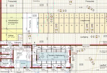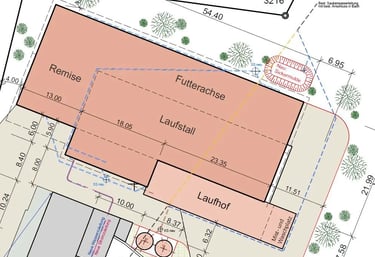 Anschliessend erstellen wir einen Vorprojektplan im Massstab 1:100. Dieser enthält Grundriss und Schnitt und dient als solide Basis für die weitere Planung und eine erste Kostenschätzung – je nach Bedarf. Zusätzlich prüfen wir den Lagerkapazitätsbedarf für Jauche und berechnen die gesetzlich vorgeschriebenen Mindestabstände.