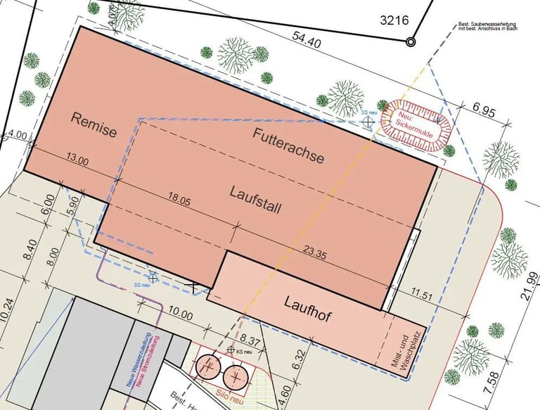 Ein zentraler Bestandteil ist die Berechnung der Lagerkapazität für Jauche und Mist, um den gesetzlichen Anforderungen zu entsprechen. Falls notwendig, erstellen wir auch einen Entwässerungsplan im Massstab 1:200.